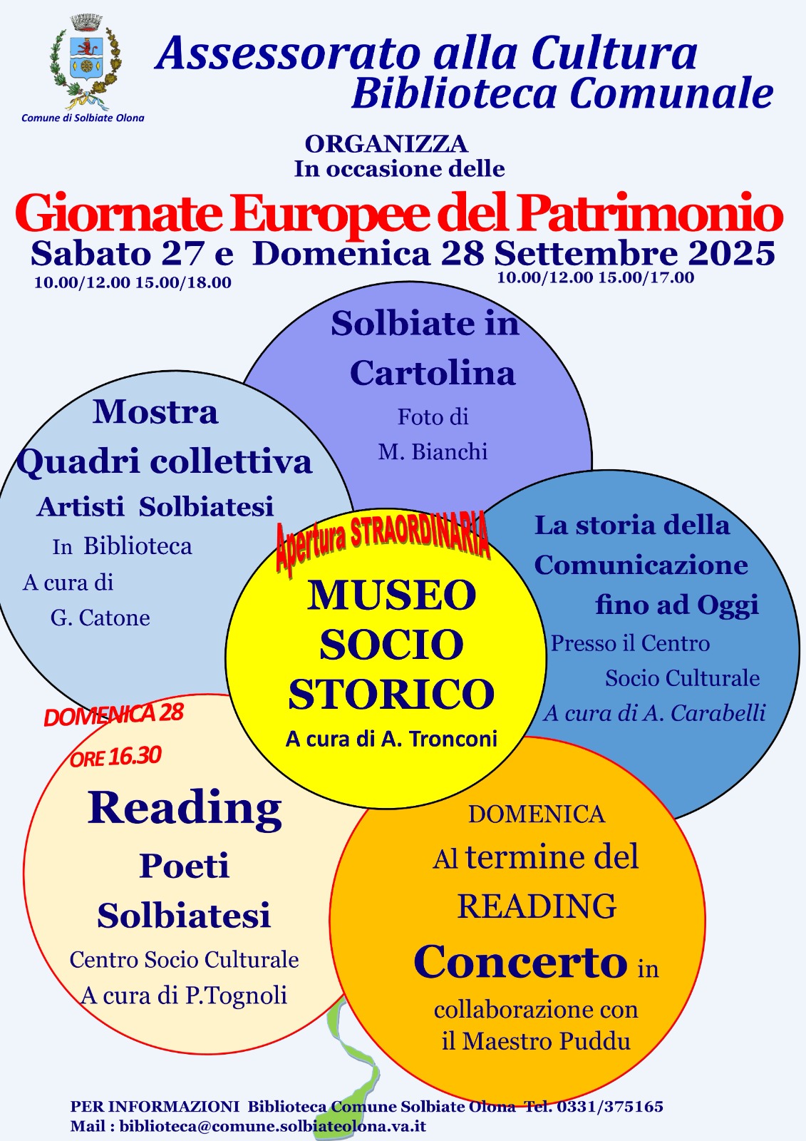 Questa prima edizione del nostro “Museo Aperto” è organizzata con entusiasmo dalla Commissione Biblioteca di Solbiate Olona, in collaborazione con l’Assessorato alla Cultura, e rappresenta per noi un importante passo verso una valorizzazione sempre più viva e partecipata del nostro territorio.