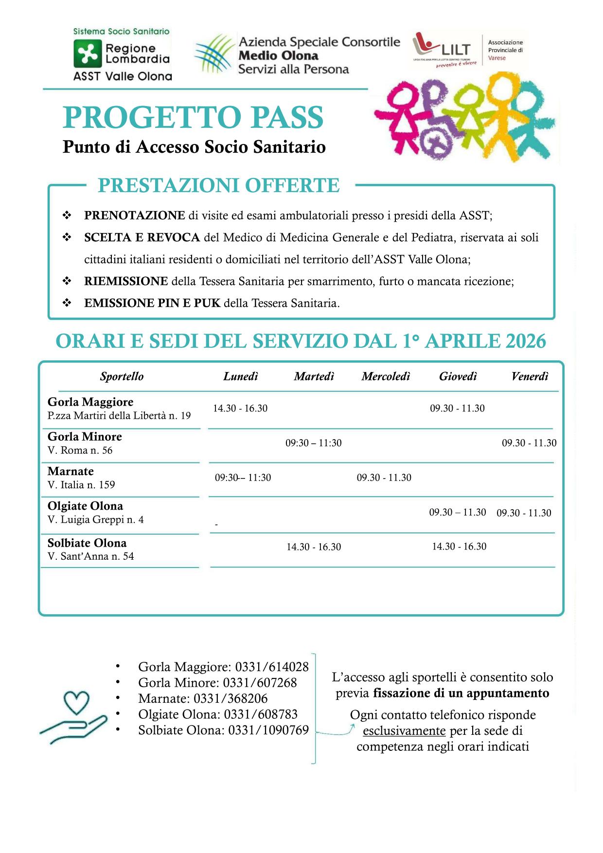 L'Azienda Speciale Consortile Medio Olona comunica che dal prossimo 1° Aprile verrà attivata la nuova organizzazione degli sportelli P.A.S.S. in collaborazione con la LILT di Varese/Busto Arsizio